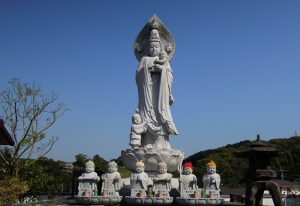妙香庵-天台の祖山はるかに合掌の大師像立つ宝満の里